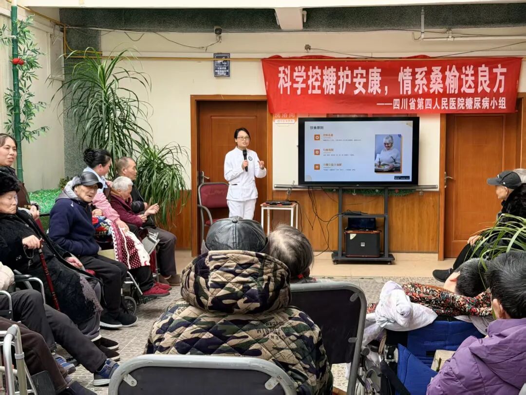 活动开始,糖尿病小组组长蒋雪霜结合老年人饮食习惯为养老院老人及其照护者带来一场别开生面的“糖尿病饮食”专题健康讲座,从主食选择、果蔬搭配、烹饪方式到进食顺序,通过具体实例生动演示如何在享受美食的同时平稳控制血糖。在场老人及照护者均认真聆听,就关心的饮食问题踊跃咨询,互动氛围热烈。